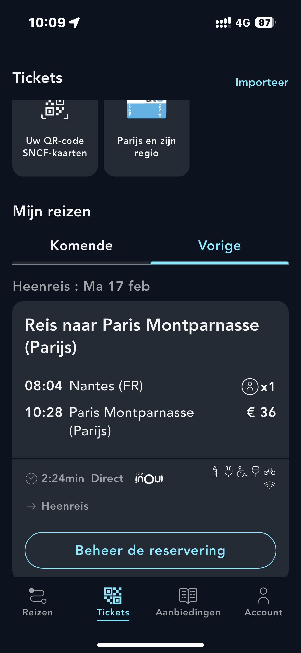 Vanuit het tabblad "Uw vorige reizen", klik op de knop "Beheer de reservering".